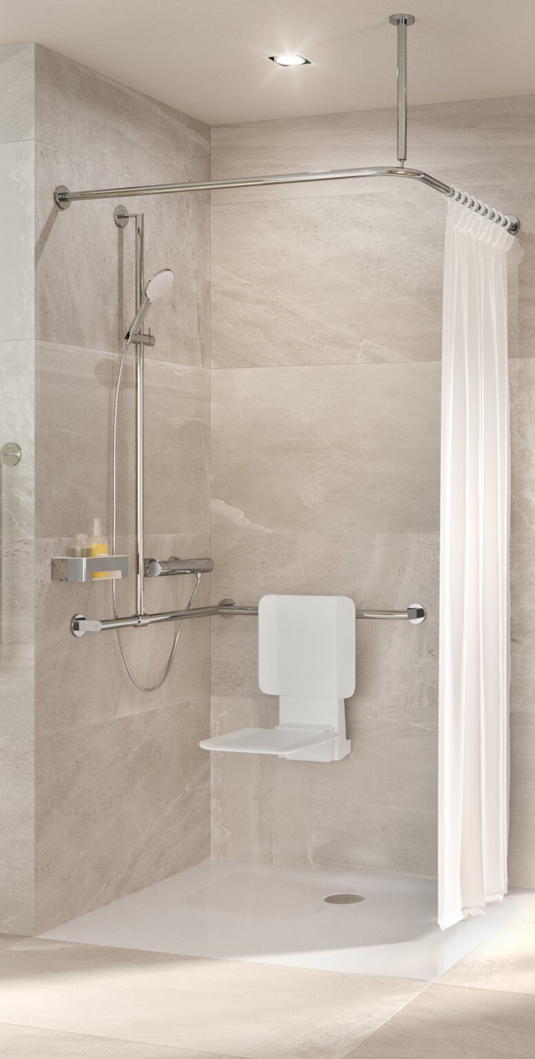 Auch in bestehenden Badezimmern lassen sich viele Maßnahmen unkompliziert umsetzen. Mobile Halte- und Stützklappgriffe oder klappbare Duschsitze erhöhen Sicherheit und Komfort und lassen sich je nach Bedarf nachrüsten ohne den Grundriss grundlegend zu verändern.