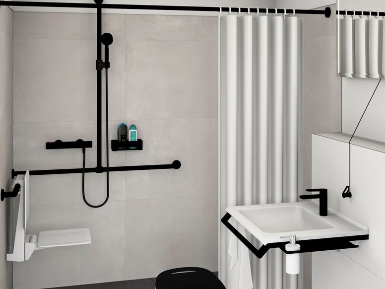 Ein kleines Bad gestaltest du am besten mit einem Waschtisch mit geringer Tiefe. Dieser spart Platz, ohne auf Funktionalität zu verzichten. Oder du integrierst Waschtische mit klugen Zusatzfunktionen: Ein modulares Waschtischsystem lässt sich sowohl im Stehen als auch im Sitzen verwenden. Dieses System umfasst einen Haltegriff, der auch als Handtuchhalter dient sowie Haken und verschiedene Ablagemöglichkeiten. Solche Haltegriffe bieten NutzerInnen Sicherheit und Unterstützung. Sie fallen aufgrund ihres reduzierten Designs nicht als barrierefreie Produkte auf. Das verleiht einem kleinen Bad einen wohnlichen, gemütlichen Charakter.