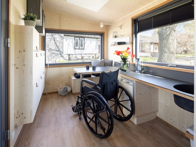 Eine weitere Besonderheit des Minihauses ist die Rampe, mit der die RollstuhlfahrerInnen das Haus komfortabel erreichen. Für eine sichere Bodenhaftung der Reifen wurde die Rampe mit einem speziellen Designerboden ausgestattet. Ebenso wie der Boden im Inneren. Ein ausziehbarer Kühlschrank, eine unterfahrbare, beheizte Tischkonstruktion sowie Spüle und Herdplatte in Reichweite erhöhen zusätzlich den Komfort für die HausbewohnerInnen. Die kleine Fläche bietet aber auch so Vorteile für Menschen mit körperlichen Einschränkungen: Die wichtigsten Dinge im Haus befinden sich auf engem Platz und sind daher leicht durch zum Beispiel eine Drehung zu erreichen. Außerdem ist es möglich, sich vom Bett direkt auf die Toilette zu ziehen, ohne den Rollstuhl zu verwenden. Dieses erleichtert tägliche Abläufe.