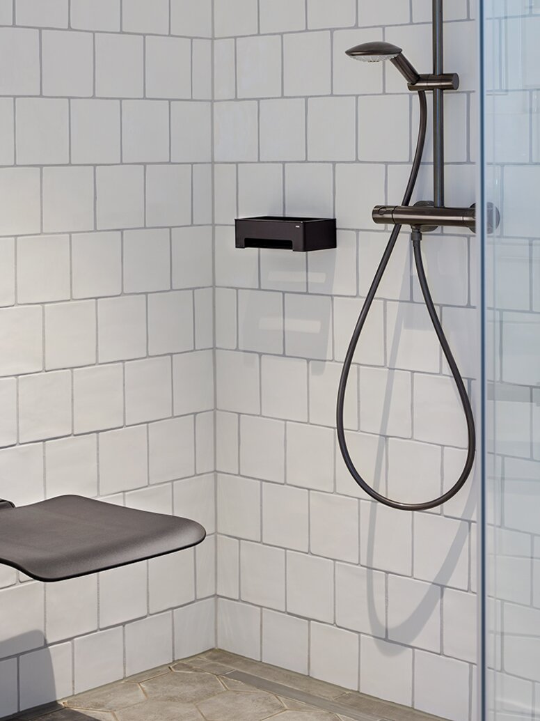 Als es darum ging, die Bäder hochwertig auszustatten, fiel die Wahl von Sroka auf HEWI. Hohen Wert legte man auf Aussehen, Haptik und Qualität der Produkte. Sie sollten über eine erstklassige Haltbarkeit und die richtige Oberfläche verfügen. Denn schwarze Bau- und Designelemente ziehen sich wie ein roter Faden durch die Gestaltung des Hotels. Harmonisch integrieren sich die HEWI Lösungen von System 900 daher in die Hotelbäder und barrierefreien Sanitärräume.