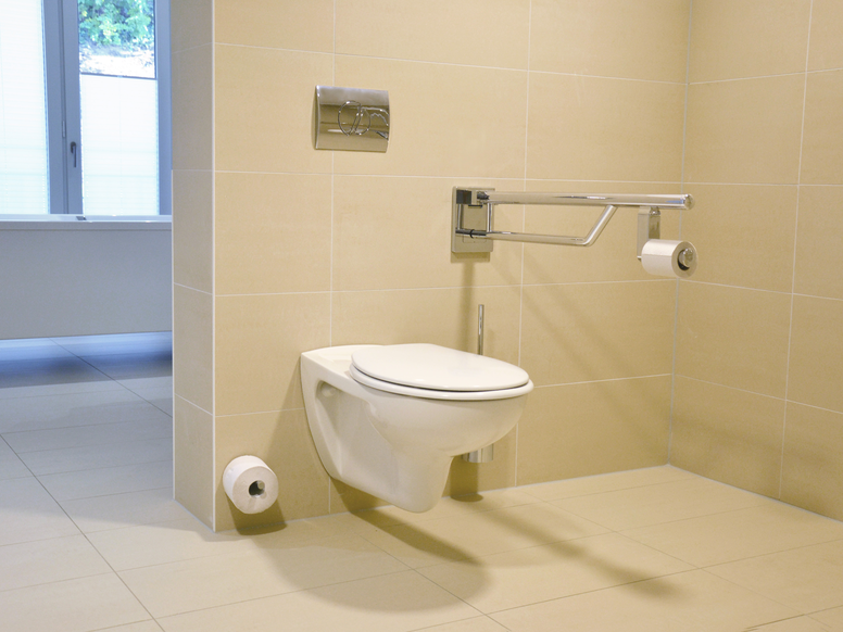 Not only has the building's equipment been invested in, but also in the quality of life offered by the high-quality ambience. In the bathrooms, for example, holding and support folding handles were installed to give the residents security and support them in their independence. WARM TOUCH was chosen as the material - these are polyamide products that are chrome-optically coated. They have the appearance of high-gloss chrome. In contrast to products with a metal surface, the holding and support handles have a warm surface, so that they are also pleasant to hold for people with increased sensitivity to cold, such as rheumatism patients.