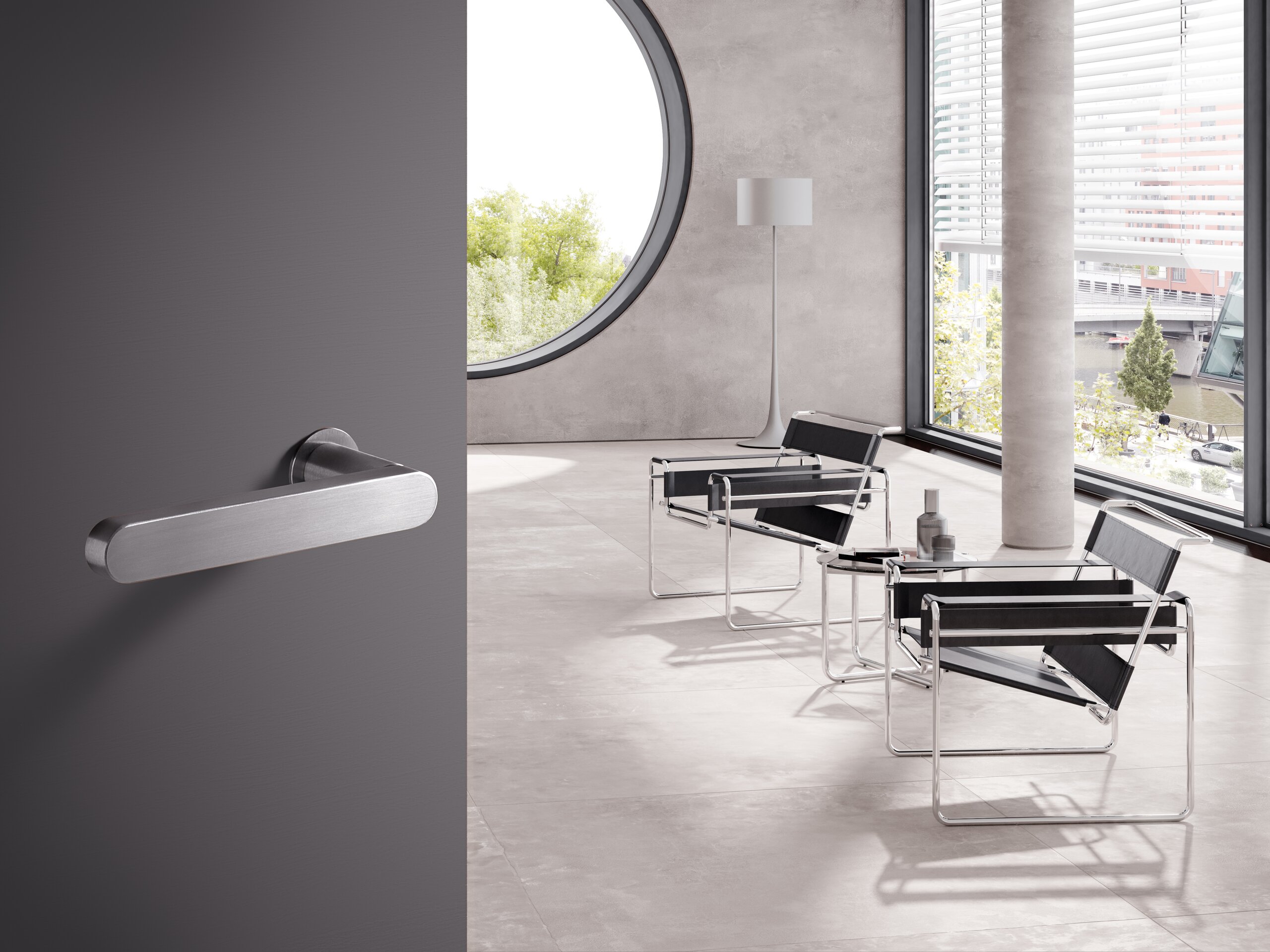 Hadi Teherani: Our task was to develop a lever handle based on the greatly reduced mini rosette developed by HEWI. The new design should be in perfect proportion to this new, very compressed fastening technology. Initially, we intensively dealt with the HEWI classic System 111, among other things. What System 111 and Range 270 have in common is that the lever handle attachment stands out from the door leaf as a round tube element.
