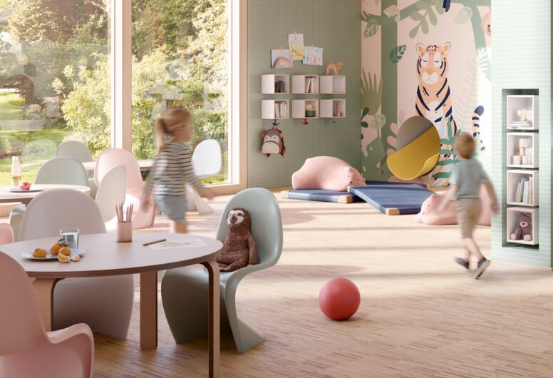 Cheerful and bright colours are ideal for putting children in a positive mood in which it is easy to learn. However, the colour scheme of a room also depends on the age of the children who primarily spend time there and should be adapted to their respective needs.