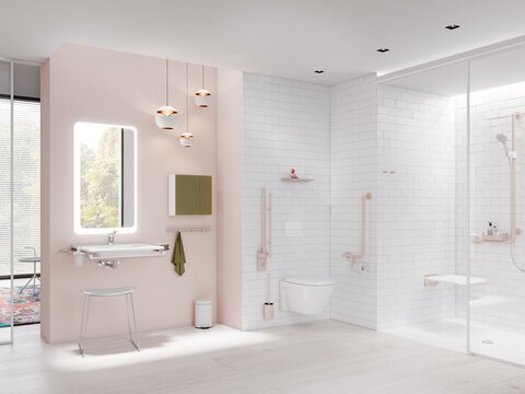 • From washbasins and accessories to fittings, hinged support rails and seats