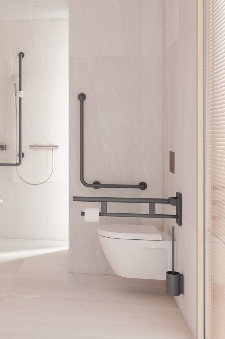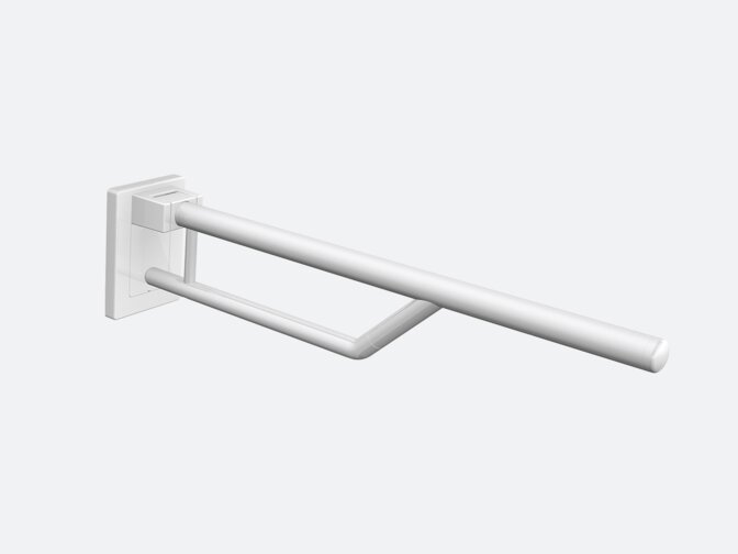 • Folding support handle Duo: This also has a round lower rail that provides optimum support for turning sideways onto the toilet