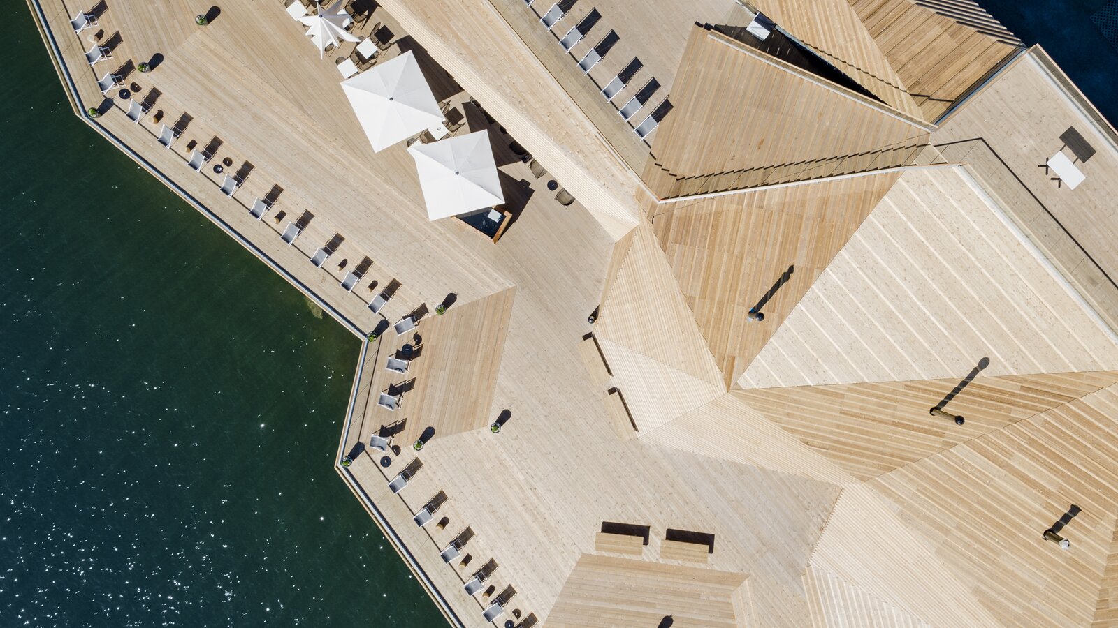 De traditionele sauna bevindt zich in een houten gebouw direct aan de oever. Het heuvelachtige silhouet van de sauna doet denken aan het Finse kustlandschap. De gedeeltelijk hoekige contouren komen ook terug in de HEWI Serie 100 wastafel in het barrièrevrije toilet van de sauna.