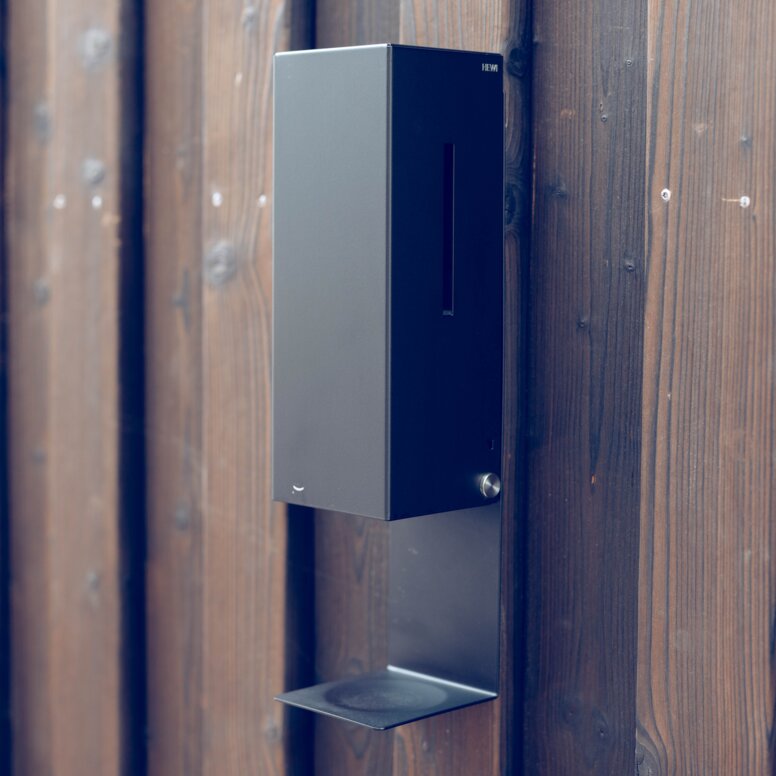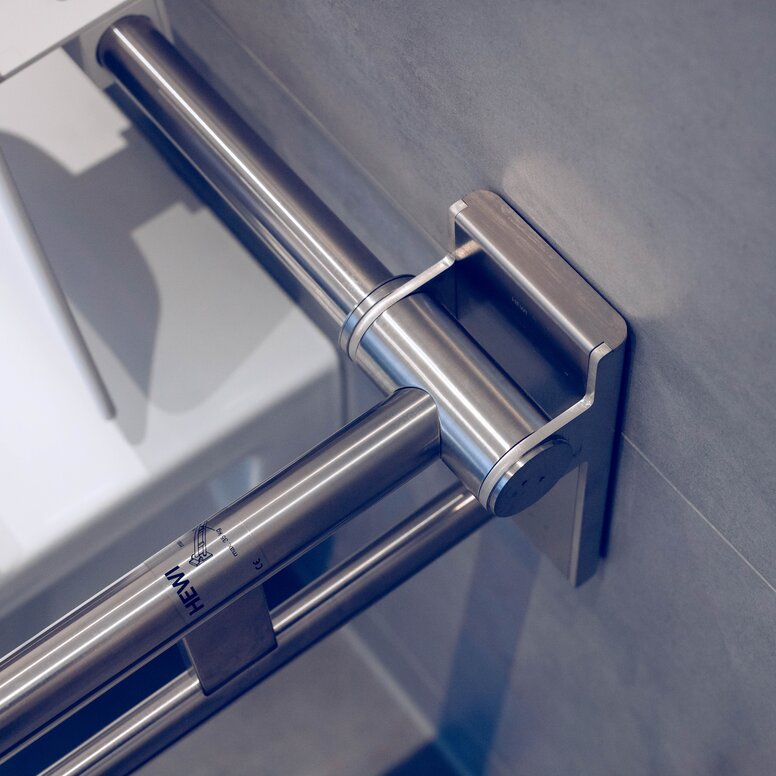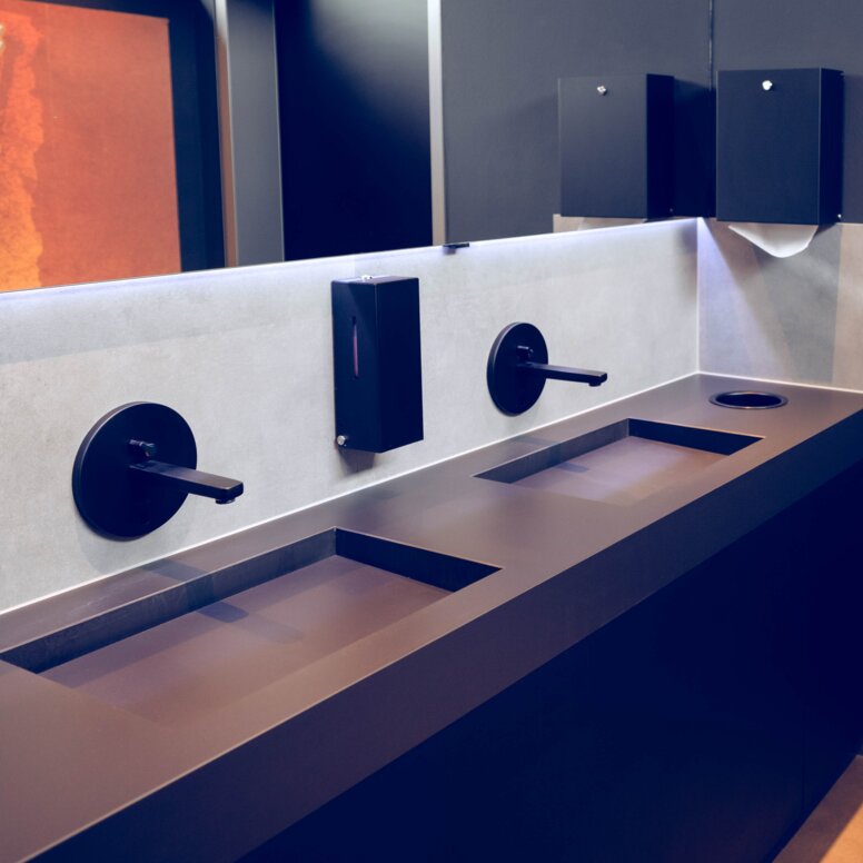 Aby dopasować się do czarnych matowych okuć drzwiowych HEWI, ale także do czarnej armatury łazienkowej i ciemnych powierzchni w nowych pomieszczeniach sanitarnych, wybór padł także na trwałe i wytrzymałe akcesoria HEWI System 900: Zastosowano dozowniki mydła w wariancie HEWI Sensoric, podajniki ręczników papierowych, kosze na śmieci i zestawy szczotek do WC, wszystkie wykonane z wysokiej jakości stali nierdzewnej i malowane proszkowo w kolorze eleganckiej, głębokiej matowej czerni. System 900 spełnia wymagania wielu typologii budynków, szczególnie w miejscach o dużym natężeniu ruchu, takich jak budynki użyteczności publicznej i restauracje, i przekonuje swoją funkcjonalnością, trwałą jakością, przemyślaną techniką montażu i higienicznym wyglądem. Również składana poręcz WC pochodzi z serii 900, która została opracowana głównie z myślą o łazienkach bez barier i przekonuje niezawodną jakością oraz dopracowanymi szczegółami technicznymi.
